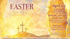 Easter Sunday | April 5 6:30 amSunrise Service Begins in Prayer Garden, Processes to Sanctuary Led by Celebration Singers 8:00 am*, 9:30 am, 11:00...