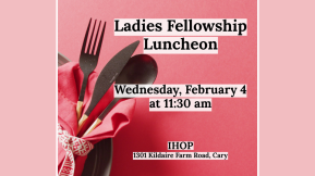 We meet on the first Wednesday of the month at 11:30 am at IHOP Cary, 1301 Kildaire Farm Road. If you plan to attend, please contact Marcia...