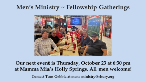 Men's Fellowship Gatherings Occasionally, we meet up for casual gatherings and have a wonderful time! Great way to stay connected in a relaxed setting. All men...