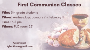 First Communion instruction for 5th grade youth (and others interested) will be on Wednesdays, 7:00-8:00 pm from January 7-February 11, 2026 in Room 251...