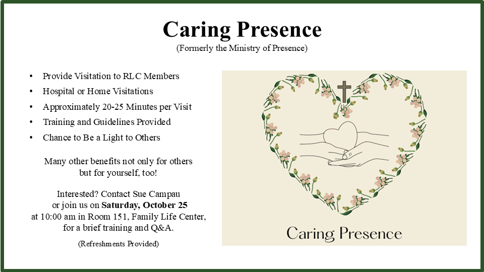 Join us on Saturday, October 25 at 10:00 am in Room 151, Family Life Center, for a brief training and Q&A. Refreshments provided.