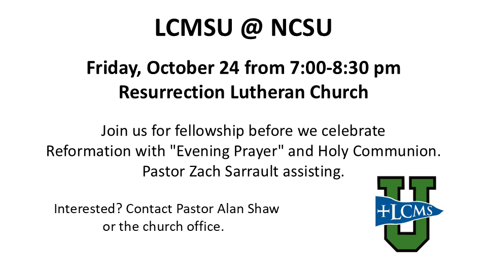 LCMSU @ NCSU will meet on Friday, October 24 from 7:00-8:30 pm at Resurrection Lutheran Church.