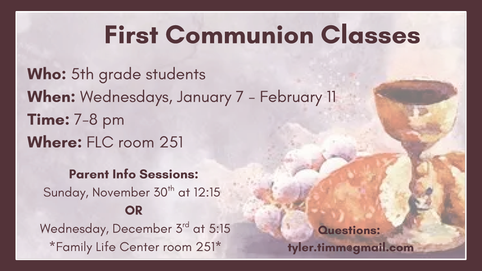 First Communion instruction for 5th grade youth (and others interested) will be on Wednesdays, 7:00-8:00 pm from January 7-February 11, 2026 in Room 251, Family Life Center, using This Is the Feast: Preparing for the Lord’s Supper (CPH). Led by Tyler Timm.