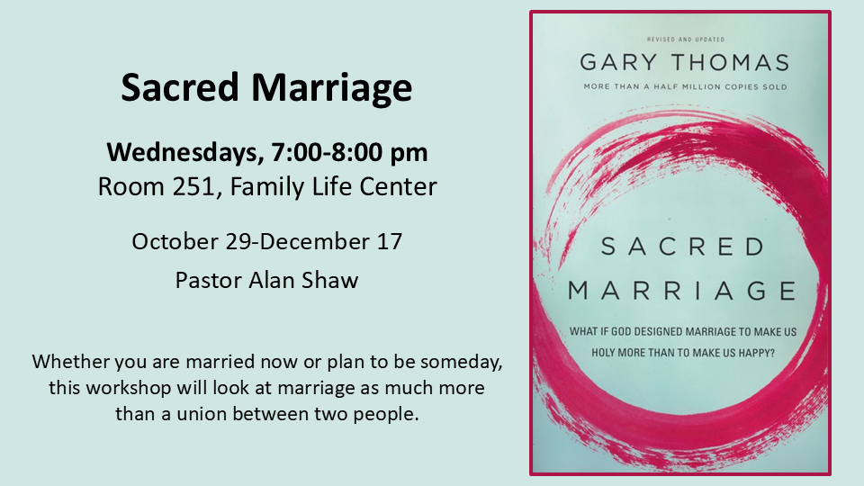 Whether you are married now or plan to be someday, this workshop will look at marriage as much more than a union between two people. It is a spiritual discipline ideally suited to help you know God more fully and intimately. Sacred Marriage shifts the focus from marital enrichment to spiritual enrichment in ways that can help you love your mate more.