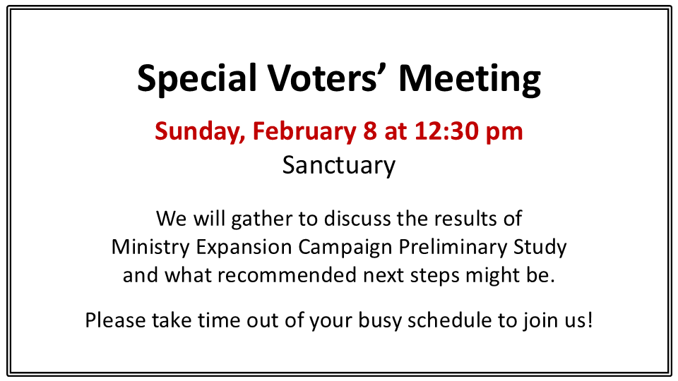 All Resurrection Lutheran Church voting members (confirmed, signed the church constitution, and old enough [18] to vote on financial/legal matters in the state of North Carolina) are invited to gather for a special meeting February 8 as we discuss the results of a Ministry Expansion Campaign Preliminary Study and what the recommended next steps for us as a congregation might be. We will gather in the main sanctuary.