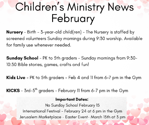 The nursery room is open for use on Sundays, 7:45 am-10:45 am. It is located near the Fellowship Hall and restrooms.